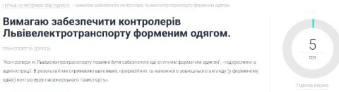 "Контролери Львівелектротранспорту повинні бути забезпечені однотипним фірмовим одягом... У результаті ми отримаємо ввічливих, професійних та належного зовнішнього вигляду контролерів пасажирського транспорту" – йдеться у тексті петиції.