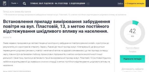 27 вересня, на порталі е-петицій Марія Щебет зареєстрував петицію з вимогою встановити прилад вимірювання забруднення повітря на вул. Пластовій, 13, з метою постійного відстежування шкідливого впливу на населення.
