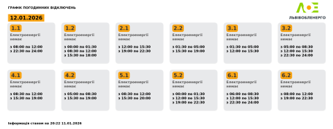 Група 1.2. Електроенергії немає з 00:00 до 01:30, з 08:30 до 12:00, з 15:30 до 18:00.