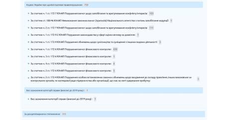 Всього в реєстрі існує 20446 записів, з них 9353 – за кримінальними правопорушеннями, 9203 – за адміністративними правопорушеннями, 1877 – за дисциплінарними правопорушеннями.
