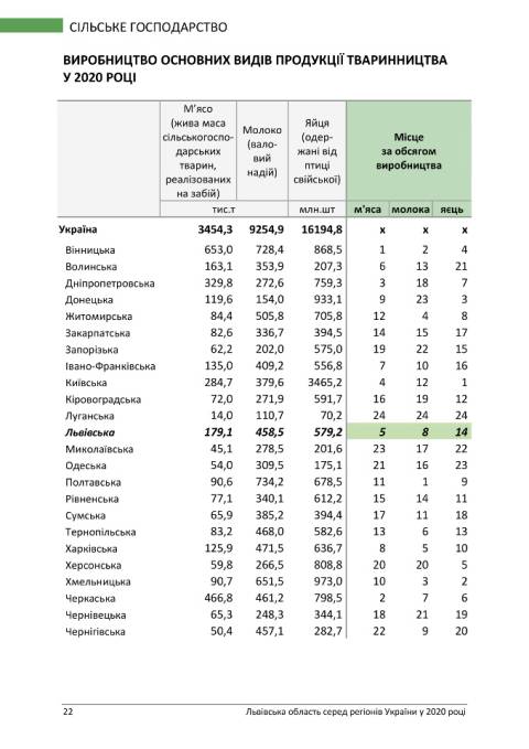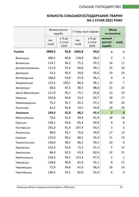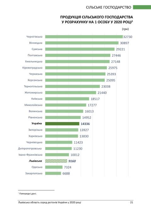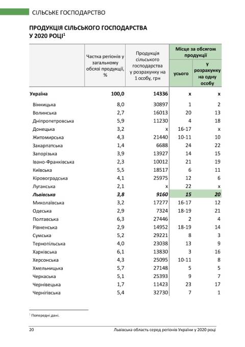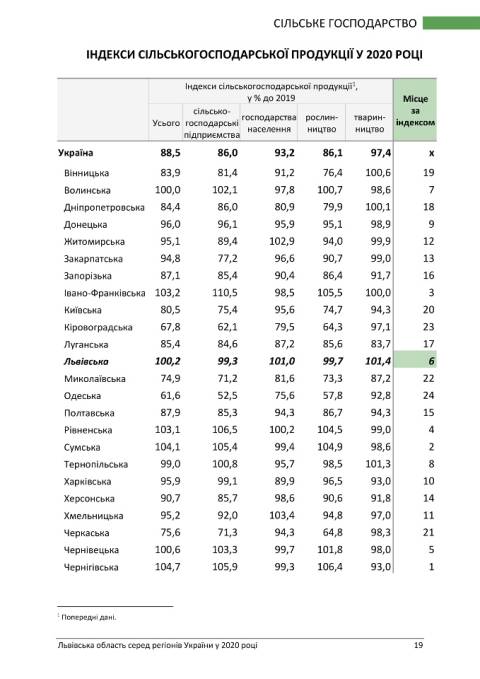У напрямку сільського господарства за індексом сільськогосподарської продукції Львівщина зайняла 6 місце та 20-те за обсягом сільськогосподарської продукції у розрахунку на одну особу.