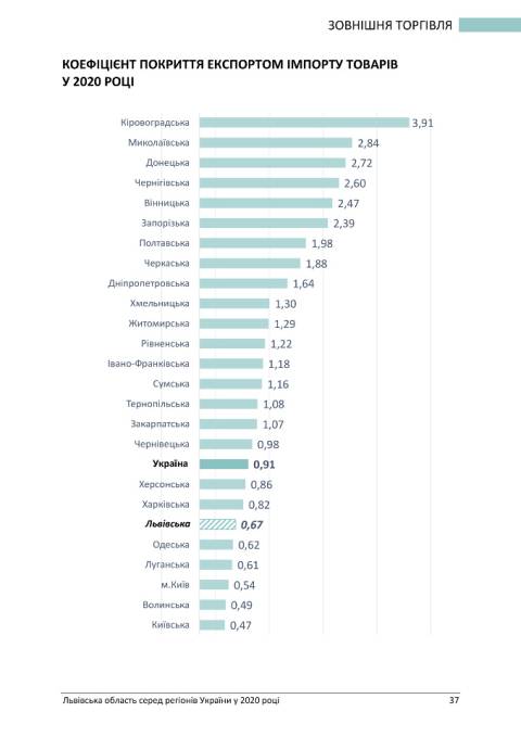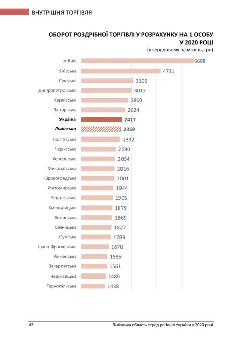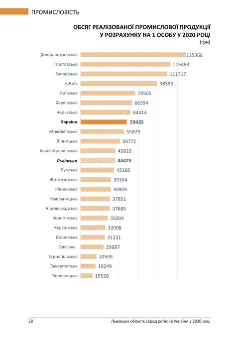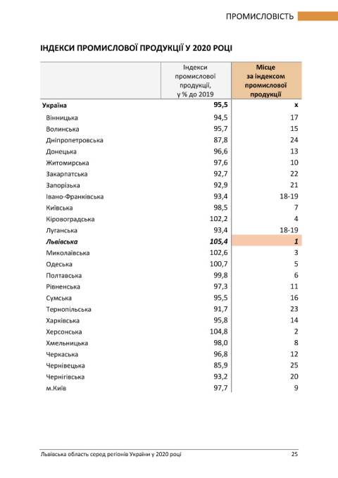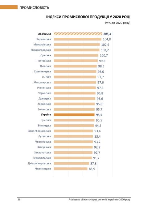 Львівщина є першою поміж регіонів за індексом розвитку промислової продукції, однак інші важливі показники, як от індекс капітальних інвестицій, опустив Львівщину на 22 позицію з 24-х регіонів.Також Львівська область входить у п'ятірку лідерів за показниками, що стосуються сфери будівництва, експорту та імпорту товарів, проте індекс обороту роздрібної торгівлі у порівнянні з 2019 роком опустив Львівщину на 21 місце.