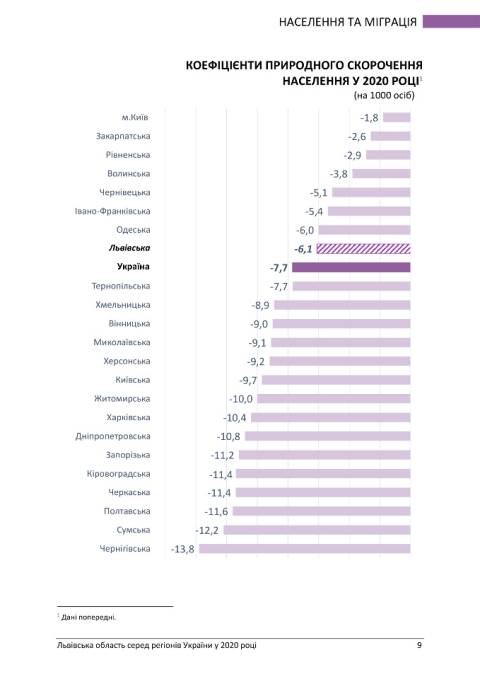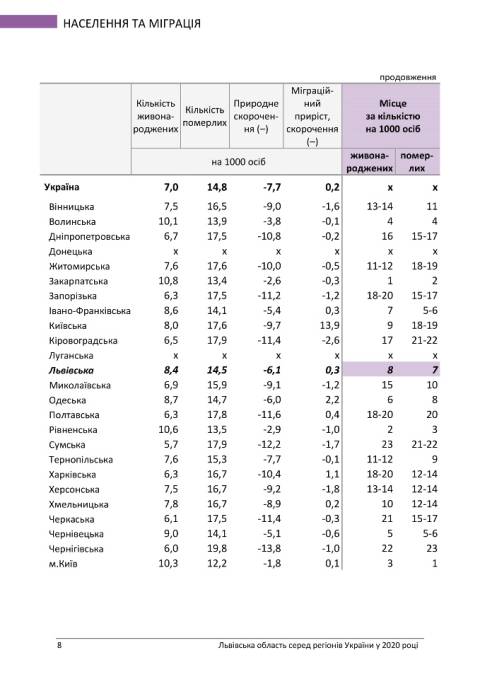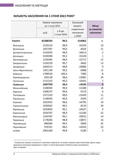 У напрямку населення та міграції ситуація в Львівській області ситуація значно краща (залежить від забезпечення населення роботою): 5-те місце у рейтингу кількості населення, 20-те за рівнем участі населення у робочій силі у віці 15-70 років та 5-те місце за рівнем безробіття.