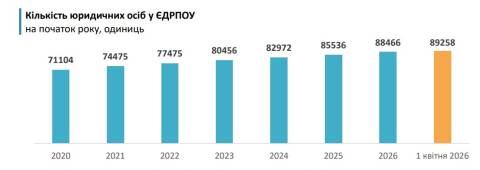 Станом на 1 квітня цього року на території Львівської області зареєстрували 89,3 тисячі юридичних осіб. Порівняно з початком року, їхня кількість зросла на 0,8 тисячі або на 0,9%.