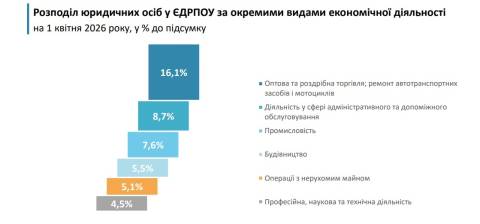 Найбільше юридичних осіб зареєстрували в гуртовій та роздрібній торгівлі, ремонті автотранспортних засобів та мотоциклів (14,3 тисячі або 16,1% від загальної кількості юридичних осіб), у сфері адміністративного і допоміжного обслуговування (7,7 тисячі або 8,7%), у промисловості (6,8 тисячі або 7,6%), будівництві (4,9 тисячі або 5,5%), які здійснювали операції з нерухомим майном (4,5 тисячі або 5,1%), професійній, науковій та технічній діяльності (4тисячі або 4,5%), у сільському,лісовому та рибному господарстві (3,5 тисячі або 3,9%).