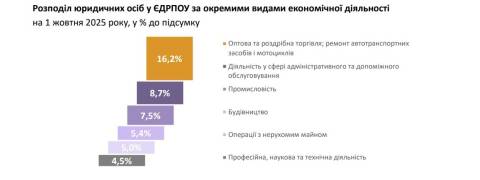Торік найбільше юридичних осіб зареєстрували в гуртовій та роздрібній торгівлі, ремонті автотранспортних засобів та мотоциклів (14,2 тисячі або 16,2% від загальної кількості юридичних осіб).