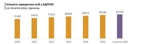 Станом на 1 жовтня цього року на території Львівської області зареєстрували 87,8 тисячі юридичних осіб. Порівняно з початком року, їхня кількість зросла на 2,2 тисячі або на 2,6%.