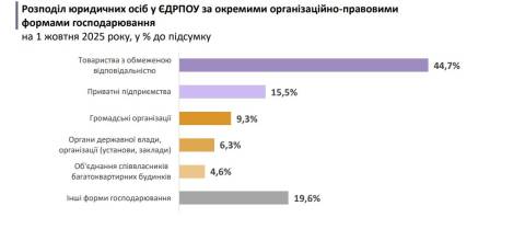 Майже половина підприємств зареєстрована у формі ТзОВ – 44,7%, а кількість приватних підприємств становила 13,6 тисячі збільшилась на 34 одиниці, а їх частка зменшилась з 16,1% станом на 1 жовтня 2024 року до 15,5% станом на 1 жовтня цього року.