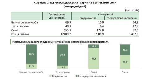 Господарства населення на 1 січня 2026 року утримували 78,5% від загальної кількості великої рогатої худоби, 87% – корів, 43,3% – птиці свійської, 14,9% – свиней.
