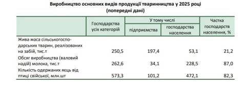 Станом на 1 січня цього року господарства усіх категорій виробили 250,5 тис. тонн м’яса, 262,6 тис. тонн – молока, 573,3 млн шт. – яєць.