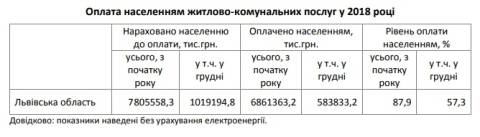 У грудні 2018 року мешканці Львівщини сплатили за житлово-комунальні послуги 583,8 млн.грн (57,3% нарахованих за місяць сум), за постачання електричної енергії – 121,4 млн.грн.
