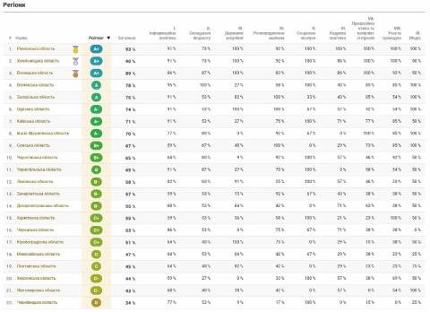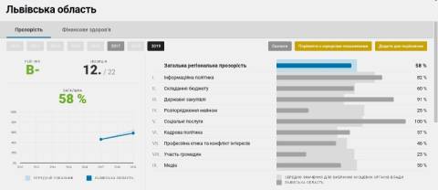 Щодо Львівщини, то прозорість інформаційної політики Львівської обласної ради становила 82%, складання бюджету – 60%, державні закупівлі – 91%, розпорядження майном – 25%, соціальні послуги – 100%, кадрова політика – 57%, професійна етика та конфлікт інтересів – 46%, участь громадян – 23%, медіа – 50%.