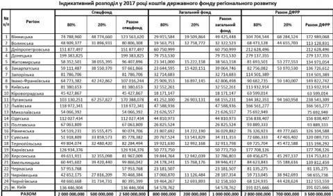 Міністерство регіонального розвитку, будівництва та житлово-комунального господарства розподілило кошти державного фонду регіонального розвитку у 2017 році для усіх областей України.