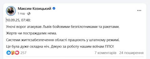 "Уночі ворог атакував Львів бойовими безпілотниками та ракетами. Жертв чи постраждалих нема. Системи життєзабезпечення області працюють у штатному режимі" – заявив Козицький.