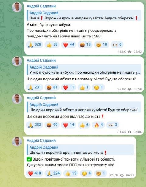 Натомість міський голова Львова Андрій Садовий написав у своїх соцмережах, що у місті було чути вибухи й закликав львів'ян про наслідки обстрілів повідомляти на Гарячу лінію міста 1580.