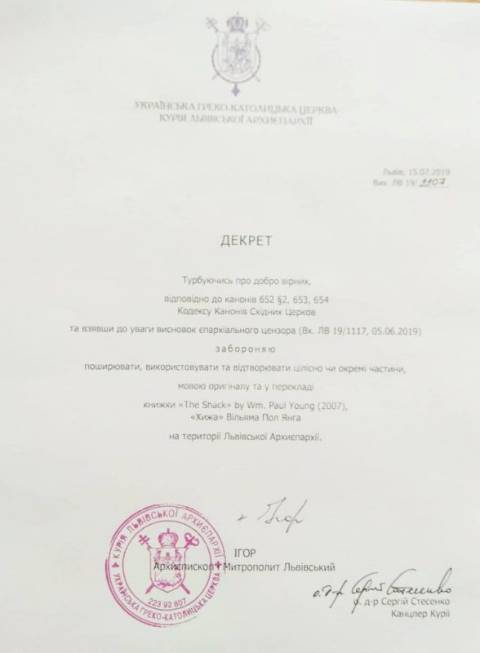 На своїй території Львівська архиєпарія УГКЦ заборонила поширювати, використовувати та відтворювати мовою оригіналу чи у перекладі бестселер канадського письменника Вільяма Пол Янга "Хижа" (The Shack).