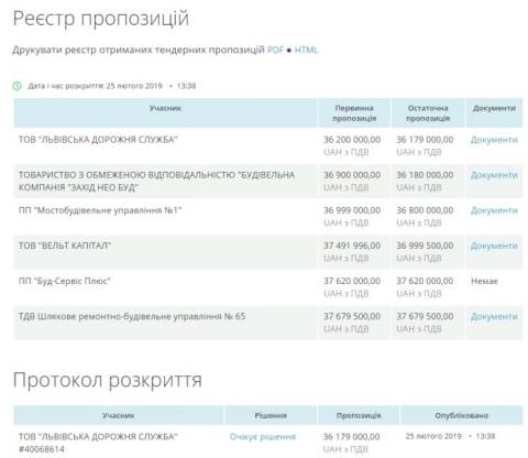 Аукціон стартував 25 лютого, участь у ньому взяли 6 компаній, а переможцем обрали ТОВ "Львівська дорожня служба", що запропонувала прокласти велодоріжку за найменшу суму – 36 179 000 грн. Додамо, очікувана вартість послуг становила 37 729 415,80 грн.
