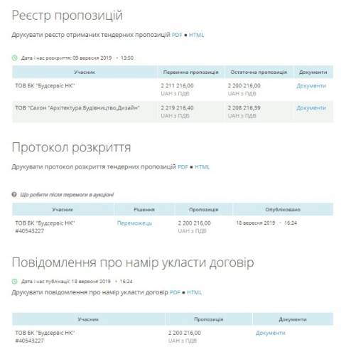 Аукціон стартував 9 вересня, участь у ньому взяли ТОВ БК "Будсервіс НК" та ТОВ "Салон "Архітектура. Будівництво. Дизайн", які запропонували облаштувати парк за 2 200 216 грн й 2 208 216,39 грн відповідно. Переможцем обрали ТОВ БК "Будсервіс НК". Додамо, очікувана вартість послуг становила 2 221 867,40 грн.