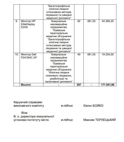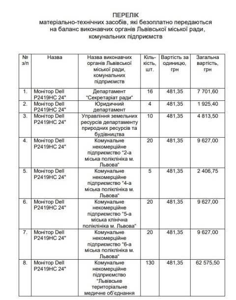 Йдеться про 357 моніторів Dell загальною вартістю 171 841,95 грн, які мають передати юридичному департаменту, департаменту "Секретаріат ради" та управлінню земельних ресурсів Львівської міськради, а також чотирьом поліклінікам міста, ТМО №1 та ТМО №2.