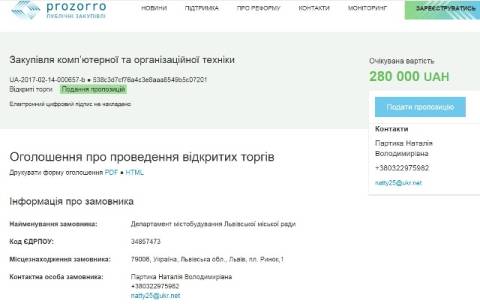 Львівської міської ради оголосила аукціон на придбання комп'ютерної техніки.