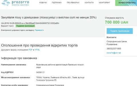 Відтак, Франківська районна адміністрація Львівської міської ради проводить закупівлю 1289 куб.м піску з домішками, однак вміст солі у піскосуміші змає бути не менше 20%.