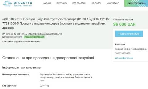 Очікувана вартість закупівлі: 96 000 грн виділено на послуги з видалення 116 аварійних дерев на вул. Левандівська, 30 (ДНЗ №6), вул. Сигнівка, 1 (СЗШ №60), вул. Виговського, 75 (ДНЗ №75).