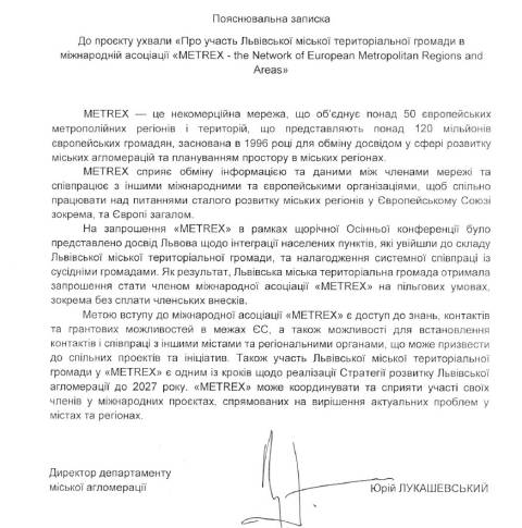 "Надати згоду на участь Львівської міської ради у міжнародній асоціації Metrex – the Network of European Metropolitan Regions and Areas. Уповноважити Львівського міського голову подати заявку про участь Львівської міської ради у міжнародній асоціації Metrex – the Network of European Metropolitan Regions and Areas" – йдеться у проєкті ухвали.