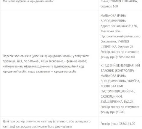 Яу йдеться у єдиному реєстрі юридичних осіб, ТзОВ «Вежа» зарежстрована у Львові на вул. І.Франка, 160. Власником та керівником фірми є Ірина Малькова із села Сокільники на Пустомитівщині, а займається ТзОВ «Вежа» неспеціалізованою оптовою торгівлею.