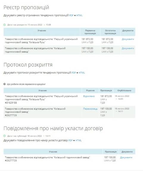 Аукціон стартував 15 лютого, участь у ньому взяли ТзОВ "Перший український годинниковий завод "Київська Русь" та ТзОВ "Київський годинниковий завод", які зголосилися виготовити годинники за 181 872 грн і 197 100 грн відповідно. Переможцем обрали Київський годинниковий завод, а початкова вартість закупівлі становила 197 120 грн.