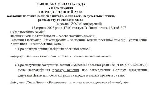 Сьогодні, 15 серпня, на засідання постійної комісії з питань законності, депутатської етики, регламенту та свободи слова Львівської обласної ради винесли питання щодо напрацювання проєкту рішення про затвердження Порядку відрядження депутатів Львівської обласної ради за кордон в умовах правового стану.