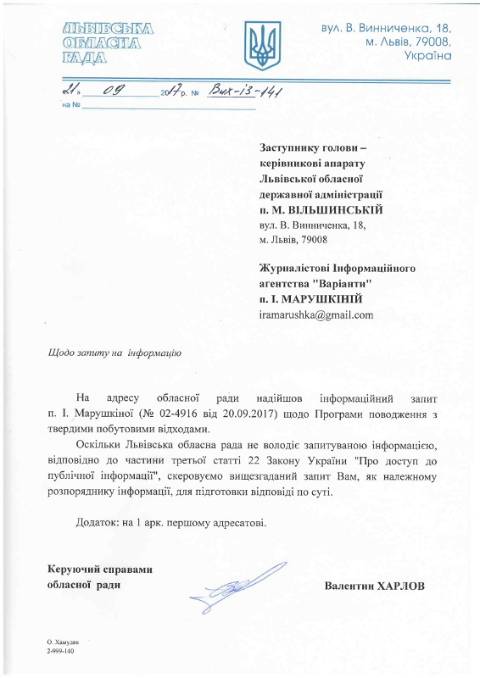 Проект регіональної Програми поводження з ТПВ до 2020 року не надходив і не був зареєстрований у Львівській облраді.