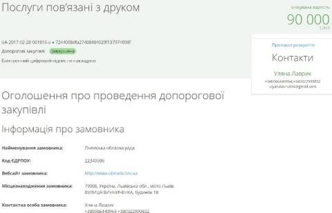 Відтак, у березні Львівська обласна рада провела закупівлю на 120 послуг, пов'язаних з друком, за 90 000 грн.