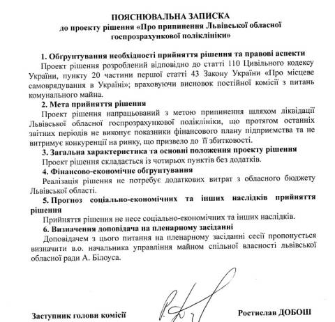 Згідно з документом, обласну госпрозрахункову поліклініку, що розташована на проспекті Чорновола, 45-а у Львові, планують ліквідувати через те, що вона впродовж останнього часу не витримує конкуренції на ринку і є збитковою.