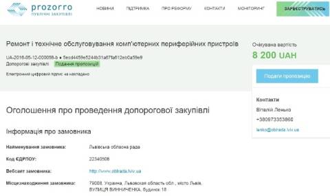 Відтак, Львівська обласна рада проводить закупівлю на 32 послуги з ремонтування і технічного обслуговування комп'ютерних периферійних пристроїв.