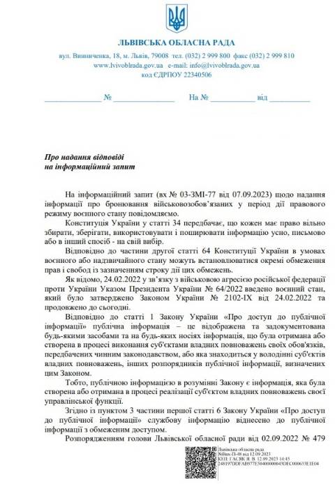 Львівська обласна рада відмовилась надати інформацію про кількість військовозобов'язаних працівників, які вона забронювала, і які через це звільнені від мобілізації.
