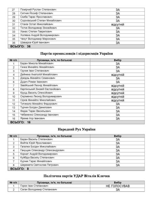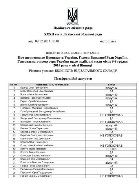 Саме про це формально засвідчують результати голосування "Про звернення до Президента України, Голови Верховної Ради України, Генерального прокурора України щодо подій, які мали місце 6-8 грудня 2014 року у місті Вінниці", які є в розпорядженні Варіантів.