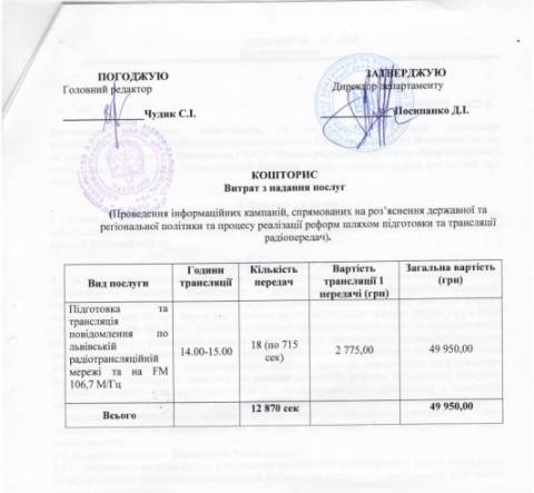 Відповідно до договору, ТОВ "Радіоінформаційний центр "Незалежність" має надати послуги з підготовки та трансляції 18 повідомлень (по 715 секунд) по львівській радіотрансляційній мережі та на FM 106,7 М/Гц. Години трансляції передач − 14.00-15.00, а вартість трансляції однієї передачі становить 2 775 грн.
