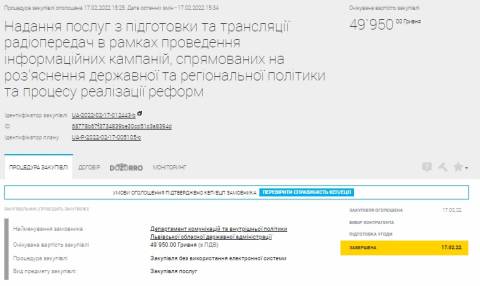 Департамент комунікацій та внутрішньої політики Львівської обласної державної адміністрації оприлюднив у системі ProZorro закупівлю без використання електронної системи на надання послуг з підготовки та трансляції радіопередач в рамках проведення інформаційних кампаній, спрямованих на роз’яснення державної та регіональної політики та процесу реалізації реформ. Вартість закупівлі становить 49 950 грн.