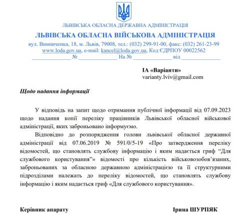 "Відповідно до розпорядження голови Львівської обласної державної адміністрації від 07.06.2019 № 591/0/5-19 "Про затвердження переліку відомостей, що становлять службову інформацію і яким надається гриф "Для службового користування" відомості про кількість військовозобов’язаних, заброньованих за обласною державною адміністрацією та її структурними підрозділами, належать до переліку відомостей, що становлять службову інформацію і яким надається гриф "Для службового користування" – йдеться у відповіді на запит.