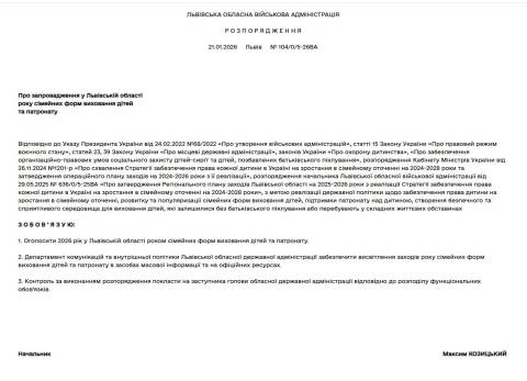 "З метою реалізації державної політики щодо забезпечення права дитини на зростання в сімейному оточенні, розвитку та популяризації сімейних форм виховання дітей, підтримки патронату над дитиною, створення безпечного та сприятливого середовища для виховання дітей, які залишилися без батьківського піклування або перебувають у складних життєвих обставинах зобов'язую оголосити 2026 рік у Львівській області роком сімейних форм виховання дітей та патронату" – йдеться у розпорядженні.