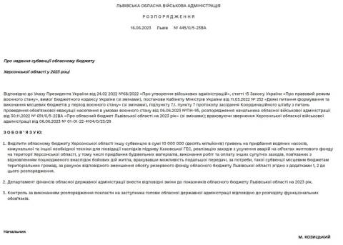 "Виділити обласному бюджету Херсонської області іншу субвенцію в сумі 10 000 000 гривень на придбання водяних насосів, комунальної та іншої необхідної техніки для ліквідації наслідків підриву Каховської ГЕС, реалізацію заходів з усунення аварій на об'єктах житлового фонду на території Херсонської області, у тому числі придбання будівельних матеріалів, виконання робіт та оплату інших супутніх заходів, пов'язаних з відновленням пошкодженого внаслідок бойових дій житла, врахувавши можливість подальшої передачі, за потреби, такої субвенції місцевим бюджетам територіальних громад, за рахунок відповідного зменшення обсягу резервного фонду обласного бюджету Львівської області" – йдеться у розпорядженні.