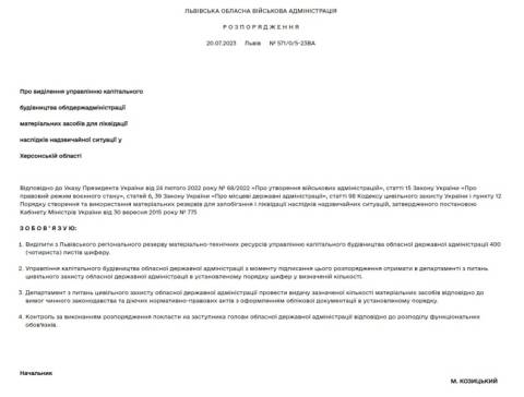 Максим Козицький розпорядився виділити управлінню капітального будівництва Львівської ОВА шифер для ліквідації наслідків надзвичайної ситуації у Херсонській області.