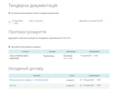 Аукціон стартував 13 грудня, участь у ньому взяла лише одна фірма – ТОВ "Інтекресі Бейз" з пропозицією 600 000 грн, яку й визнали переможцем торгів. Очікувана вартість закупівлі також становила 600 000 грн.