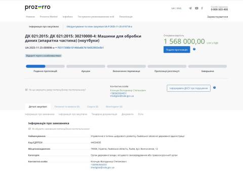Управління з питань цифрового розвитку Львівської ОВА оголосило тендер у системі ProZorro на закупівлю ноутбуків, які переможець тендеру має поставити до 20 грудня 2025 року.