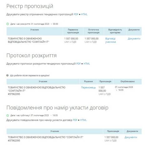 Аукціон стартував 1 листопада, участь у ньому взяла лише одна фірма – ТОВ "Софтлайн ІТ" з пропозицією 1 557 000 грн, яку й визнали переможцем торгів. Натомість очікувана вартість закупівлі становила 1 560 000 грн.