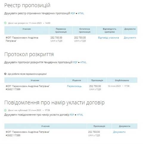 Аукціон стартував у січні, на нього подалася лише підприємниця Андріяна Гарасимович з пропозицією у 252 750 грн. Її й оголосили переможницею закупівлі, а очікувана вартість послуг становила 300 000 грн.