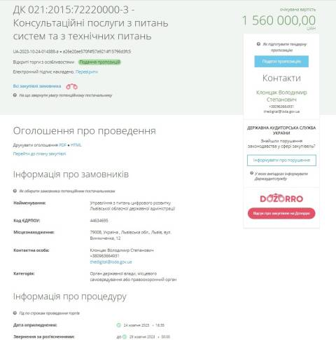 Аукціон стартує 1 листопада, а очікувана вартість закупівлі становить 1 560 000 грн.