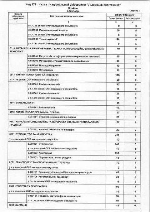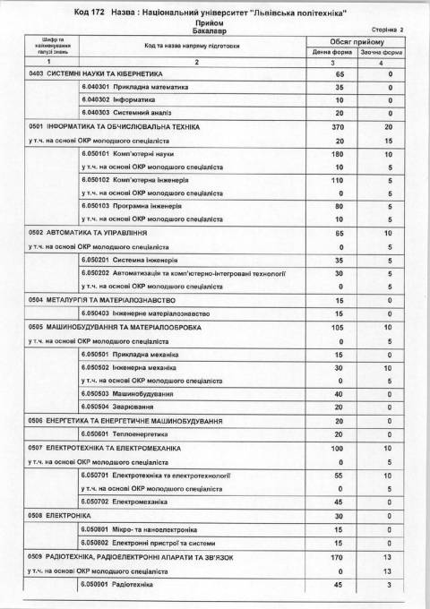 Національний університет «Львівська політехніка» пропонує для абітурієнтів, які вступають на бакалаврат, 2195 бюджетних місць на денній формі навчання та 92 на заочній.