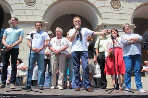 Львівське віче Самопомочі бунтує та хвилюється супроти Порошенка й Гройсмана під пивним плакатиком Альфа Джаз Фесту.