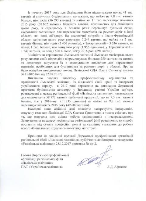 "Наведені вище офіційні дані повністю заперечують інформацію, озвучену головою Львівської ОДА Олегом Синюткою, а також свідчать про те, що озвучена ним оцінка роботи залізничників є несправедливою. Звинувачення на адресу керівництва регіональної філії розцінюємо як спробу поставити під сумнів професійні якості та сумлінне ставлення до роботи всього 40-тисячного трудового колективу магістралі", – йдеться у повідомленні.